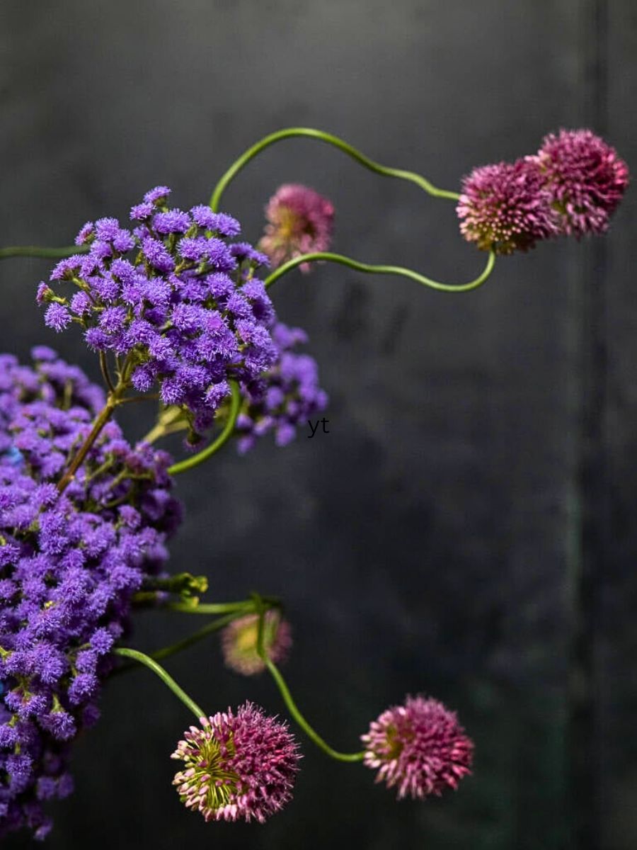 Behind this bloom is a breeder known for turning sparks of inspiration into living art. Ball's Strange Wonders line was created to celebrate the extraordinary, and Ageratum JJ does exactly that. It gives Alexander the freedom to push boundaries, offering a flower that is rare, reliable, and resilient. One that doesn’t just fill space, but defines it. In combination with these playful Alliums and the blue Hydrangea, Alexander creates magic because floral design is all about touching our souls.