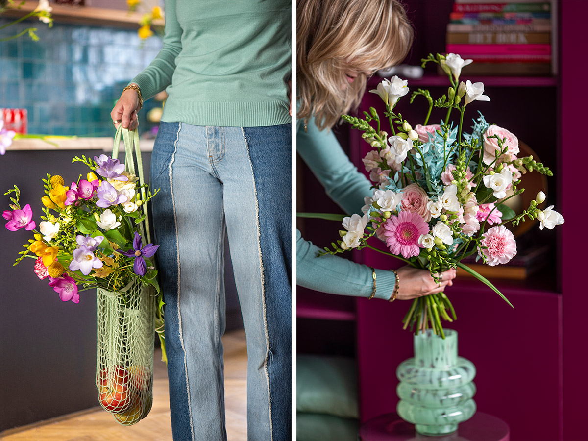 "It's a real Freesia, alright. But one that stands tall and proud at 80 centimeters. It has a strong fragrance, a big comb, and we keep the leaves on. That gives it a completely different look and feel from what florists are used to."