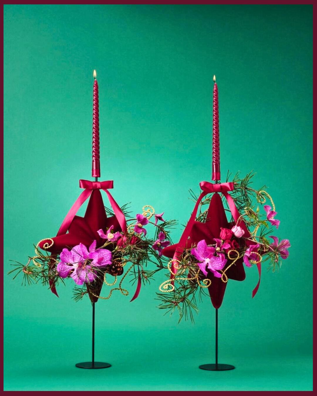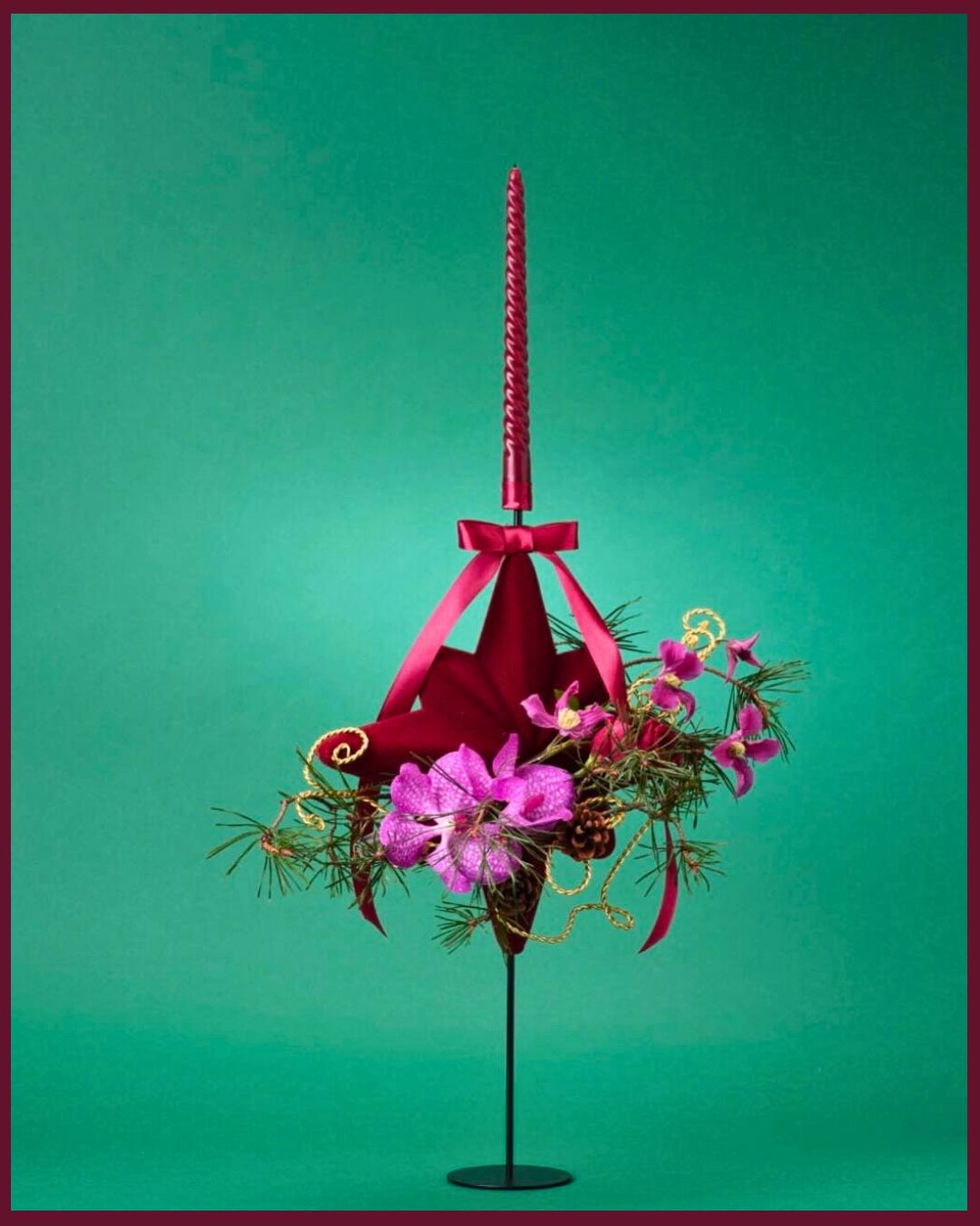 The candles, ribbon, and star-shaped structure were all selected in the same deep crimson tone to echo the main trend color, while the purple Clematis and Vanda introduce a mysterious, almost nocturnal quality. The addition of green Abies brings freshness and texture, instantly evoking the Christmas mood. A few gold details, subtle but intentional, add warmth and a festive glow. I wanted this arrangement to express the essence of Christmas: light and warmth in the middle of winter, a celebration of beauty, reflection, and connection. The contrast between the rich red and the vibrant purple gives energy, while the evergreens ground the composition in nature.