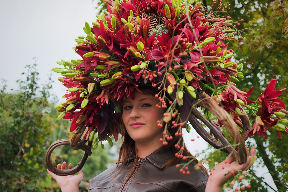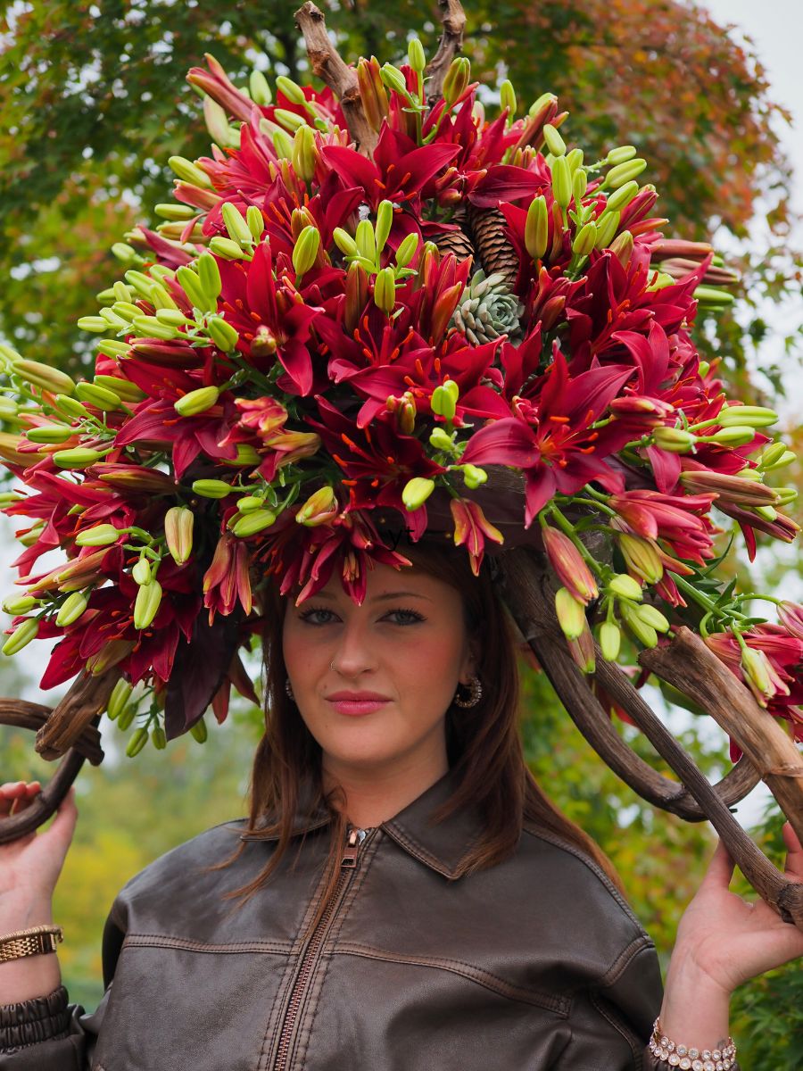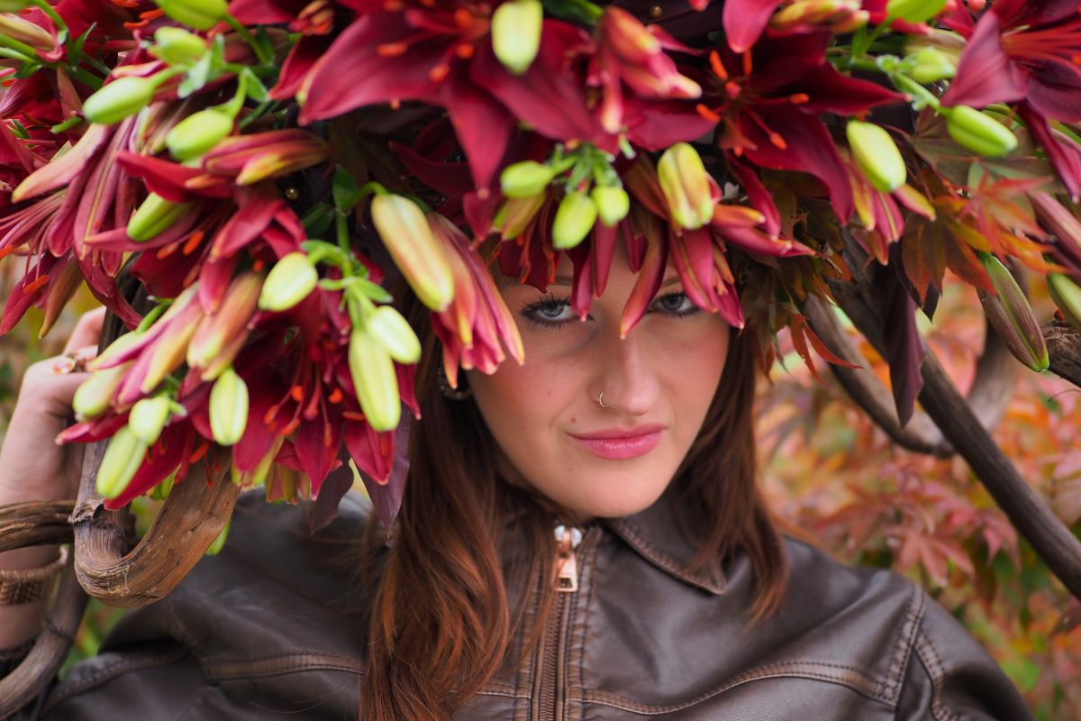 I started with curled wood and used renewal floral foam, the new Smithers-Oasis blocks, and created a form that could fit my head. And with some materials like succulents, autumn leaves, and pine cones, I created a base. Afterwards, I added 50 Dark Secret Lilies to make the whole. One of my son's friends, Manon, modeled for me, and I just loved the vibe. Youth and natural beauty, it was exactly what I wanted to feel. As a nature photographer, my sister is really good at highlighting beauty; she did an awesome job.