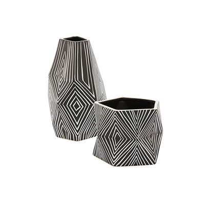 Stoneware Astro Vase features an asymmetrical geometric silhouette with hand-painted pattern, resulting in a unique and modern piece for home or design. Sizes: 7"x 6.5"x 5.5" 6.25"x 6.25"x 9.5"