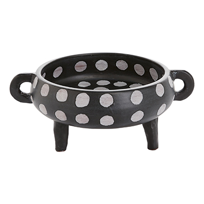 The Neo Bowl is a shallow ceramic bowl, made by hand, with elegant feet and handles in a matte black finish with cream polka dots. Size: 13.25"x 10.5"x 5.25"