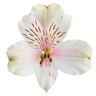Alstroemeria Prestige is a white flower with some light hues of champagne and cream and very dark red - almost brown - spots and stains in its heart. A big flower that catches the eye immediately.
