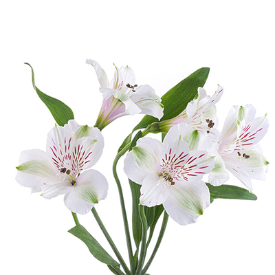 Alstroemeria Virginia is a bright white alstro with a yellow splash and burgundy streaks. It is a very popular alstroemeria.