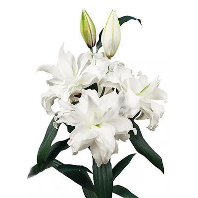 Cutflower Roselily Angela is a double pristine white, sweetly scented flower adorned with lightly ruffled edges. The magnificent star-shaped flowers on top of spirally arranged glossy green leaves are a real eye-catcher.