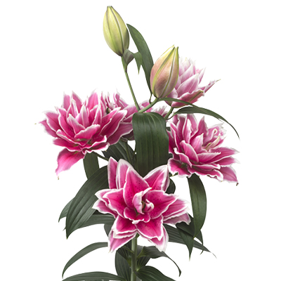 Cutflower Roselily Samantha is a vigorous flower with sturdy, erect stems bearing lance-shaped, spirally-arranged, glossy, dark green leaves and large, fragrant, double, spotted, reddish-pink to deep pink flowers with white petal margins.