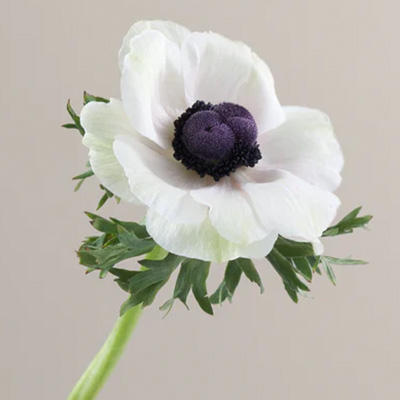 Silky-like petals twirl around a contrasting dark center giving this anemone a neutral yet bold visual appeal.