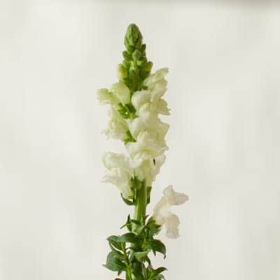 The Antirrhinum Potomac™ Early White (also called Snapdragon) make wonderful additions to multicolored and monochromatic mixed bouquets. The Potomac Early White is a strong growing snapdragon with ivory white petals and just a hint of a lemon sorbet throat. They have good strong stems and it is a long lasting cut flower. Potomac is ideal for production during periods of high light, long days and warm temperatures. Plants produce tall, strong stems and long spikes with good flower quality for excellent retail show and vase life. Can be grown year-round with supplemental high-intensity lighting.
