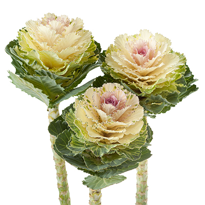 Brassica Oleracea Empire Akilina is a member of the Brassica Empire Series. The flower starts with a pink fringed leaves heart, shifting to white and finishes with green outer leaves. Brassica Empire series is the next generation of high-quality ornamental cabbages. Extensive breeding efforts have resulted in a brassica series with and an extraordinary appearance, long stems of at least 80 cm, disease resistance, and a great reduction of the typical brassica odor. The series consists of 16 strong varieties with flat or fringed leaves in a spectrum of ivory, green, pink, and purple color combinations. Check out all brassica Empire varieties on Evanthia.