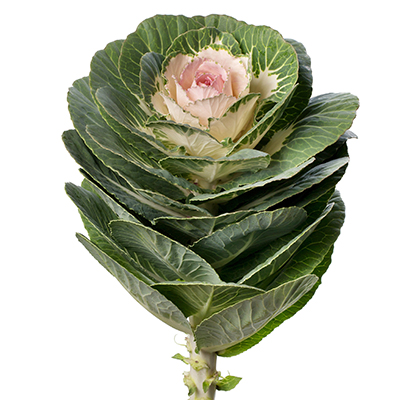 Brassica Oleracea Empire Antonina is a member of the Brassica Empire Series. The tall flower head starts with a soft-pink round leaves heart, shifting to big round white leaves and finishes with green outer leaves. Brassica Empire series is the next generation of high-quality ornamental cabbages. Extensive breeding efforts have resulted in a brassica series with and an extraordinary appearance, long stems of at least 80 cm, disease resistance, and a great reduction of the typical brassica odor. The series consists of 16 strong varieties with flat or fringed leaves in a spectrum of ivory, green, pink, and purple color combinations. Check out all brassica Empire varieties on Evanthia.