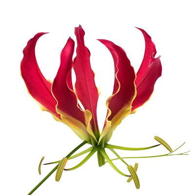 Gloriosas are native to tropical and southern Africa to Asia, and naturalized in Australia and the Pacific as well as being widely cultivated. This characteristic flower comes to full bloom and has a long vase life.