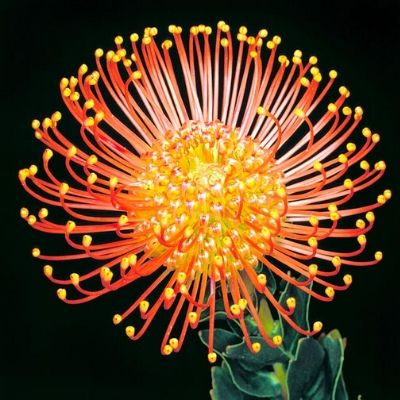 Leucospermum Cordifolium is a bright dark orange pincushion flower with a globe-shaped head with a flattened top. The inflorescences consist of a large number of small flowers. It is the stiff protruding styles of the flowers which are the source of the common name 'pincushion' for this genus.