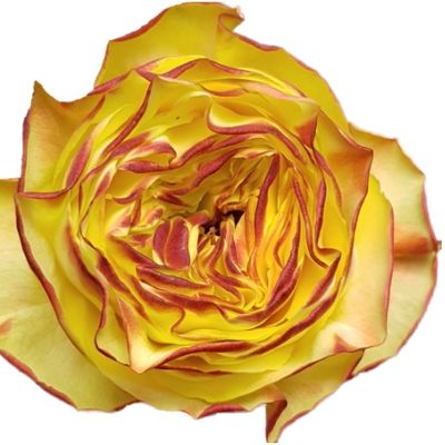 Rose Yellowstone is a filled yellow garden rose with red edges. The size of the bloom is way above average for a rose.