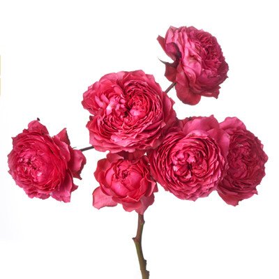 Garden Spray Rose Julietta Raspberry is a mono-tone cerise-colored spray with a delicate white kind of stripe, making it an instant eye-catcher.