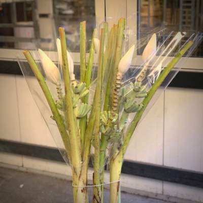 The musa White, a.k.a. banana flower is, of course, the blossom found along with bananas on the tree, and they are often used in tropical flower arrangements. Normally the color is purple/pink to red. A white musa is quite uncommon.