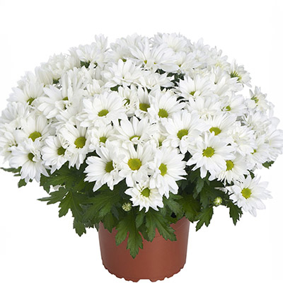 Chrysanthemum Alpine Time is an improved white daisy pot mum that will be a great addition to your assortment. This plant is whiter than white, with fresh and green foliage.