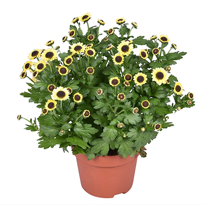 Chrysanthemum Santini Yin Yang Yellow is a long-lasting yellow mini chrysanthemum. This santini certainly stands out because of its remarkable black heart combined with its bright yellow petals, giving the plant a beautiful contrast.