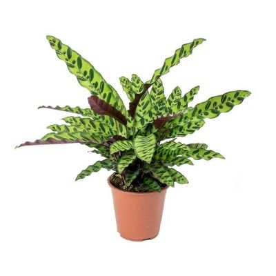 Calathea lancifolia is a wonderfully showy houseplant. It has upright, lance-shaped leaves with long wavy edges that form in clumps, spreading slowly over time. The leaves are variegated with dark green strokes on a pale green background. The undersides are a burgundy red and velvety to the touch. The Rattlesnake plant is also sometimes known as Calathea Insigne Lancifolia.
