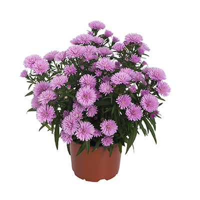 Aster Showmakers® Baby Pink is the pink-colored variety in the Aster Showmakers series. With a name like 'Showmakers'®, you’d better have something to show for it. If you ask us, this double-flowered aster series really steals the show. No wonder there’s a peacock on its logo. Its packed-with-petals flowers in blues and violets make it a real eye-catcher. On its own in a large pot for the terrace or in combination with other plants. The 'Showmakers'® is a real diva. With the proper attention and care, we can guarantee you a plant with a beautiful, long-lasting flower display: a plant that meets the high standards for quality that we at Royal Van Zanten set for our products. Showmakers® Aster Care Tips: • They like a place in the sun with a little shade now and then. In a really sunny position, however, they will need a bit more water than when placed in the shade. So, in this case, water them regularly. • It’s important to avoid that water remains in the pot, since they really dislike having ‘wet feet’. • If you want to enjoy your plant even longer and see even more flowers appear, remove faded flowers on a regular basis.