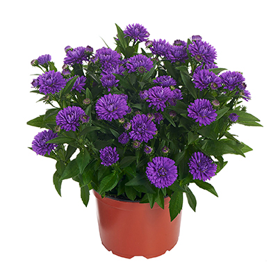 Aster Showmakers® Indigo Ice is the indigo-colored variety in the Aster Showmakers series. With a name like 'Showmakers'®, you’d better have something to show for it. If you ask us, this double-flowered aster series really steals the show. No wonder there’s a peacock on its logo. Its packed-with-petals flowers in blues and violets make it a real eye-catcher. On its own in a large pot for the terrace or in combination with other plants. The 'Showmakers'® is a real diva. With the proper attention and care, we can guarantee you a plant with a beautiful, long-lasting flower display: a plant that meets the high standards for quality that we at Royal Van Zanten set for our products. Showmakers® Aster Care Tips: • They like a place in the sun with a little shade now and then. In a really sunny position, however, they will need a bit more water than when placed in the shade. So, in this case, water them regularly. • It’s important to avoid that water remains in the pot, since they really dislike having ‘wet feet’. • If you want to enjoy your plant even longer and see even more flowers appear, remove faded flowers on a regular basis.