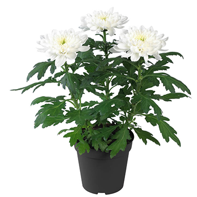 A floriferous pot chrysanthemum with well-filled pristine white flowers. Its flowers are large and fluffy.