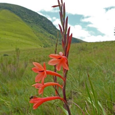 Watsonia Transvaalensis has a depressed globose corm, growing on several generations of old corms, which have a rather sparse fibrous covering. The four leaves are rigid in texture and sword-shaped, the lowest one being the longest and up to 90 cm in length. The Watsonia are fast-growing, hardy plants. When whole fields come into bloom in the summer, the flowers create a spectacular image. The plant gets its name from Sir William Watson, an 18th-century British botanist. The flowers vary in shape and color. The petals are sometimes pointed and are near-white, pale pink, old rose, salmon, and terracotta in colour, each with a central dark pink line. The flowering time of this plant is from October to November.